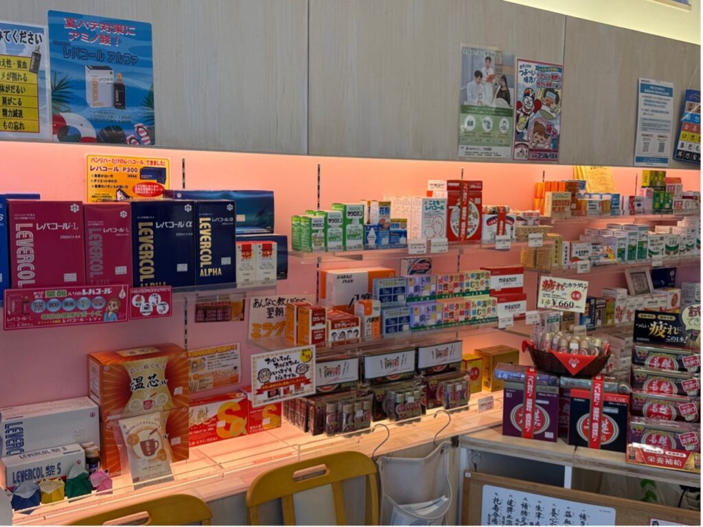 「ユタカ薬局」の店内をよく見ると、薬やサプリメント、漢方薬が並んでいます。